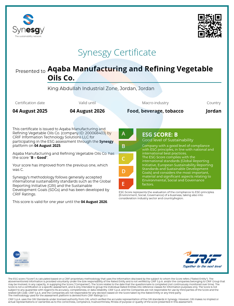 Aqaba Manufacturing and Refining Vegetable Oils Co. is dedicated to complying with all relevant environmental laws, regulations, and industry standards. We strive to exceed the minimum requirements and implement best practices to minimize our environmental impact.